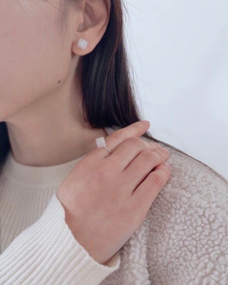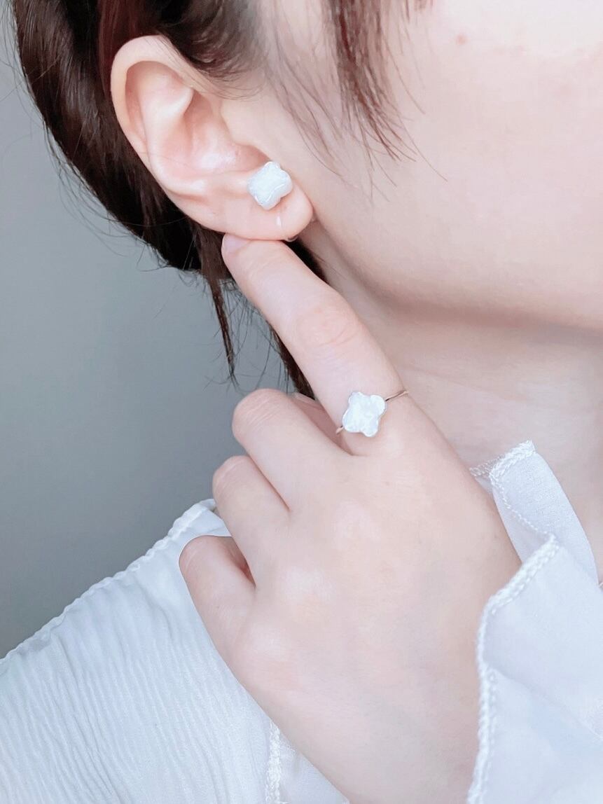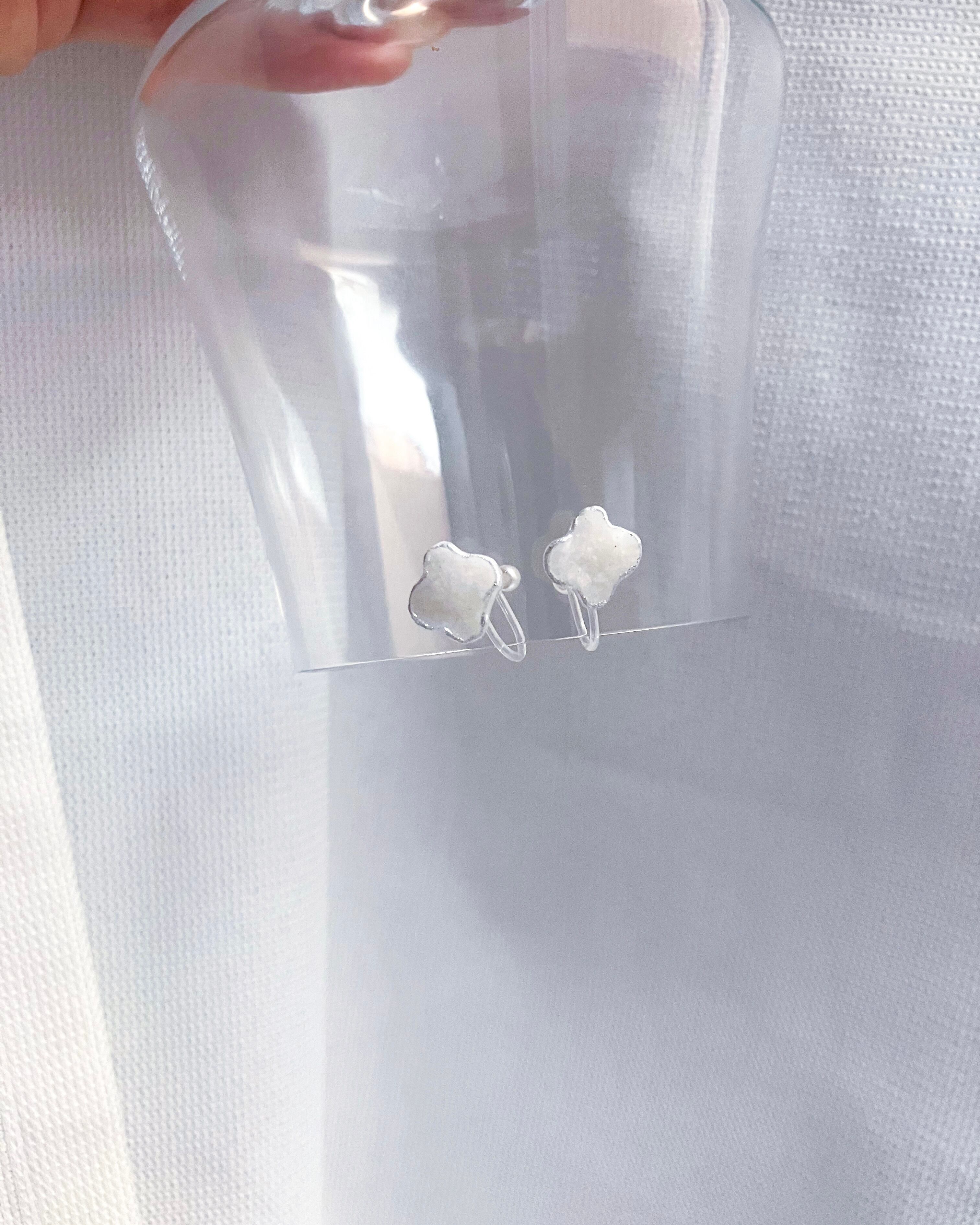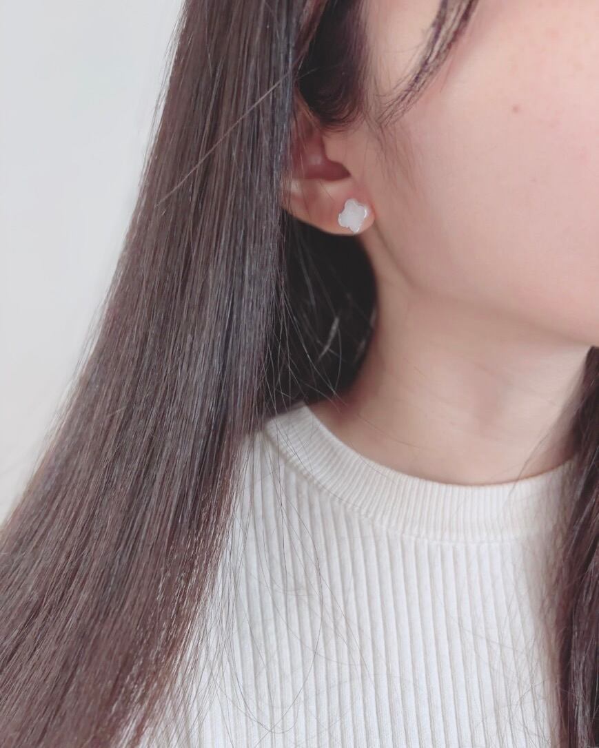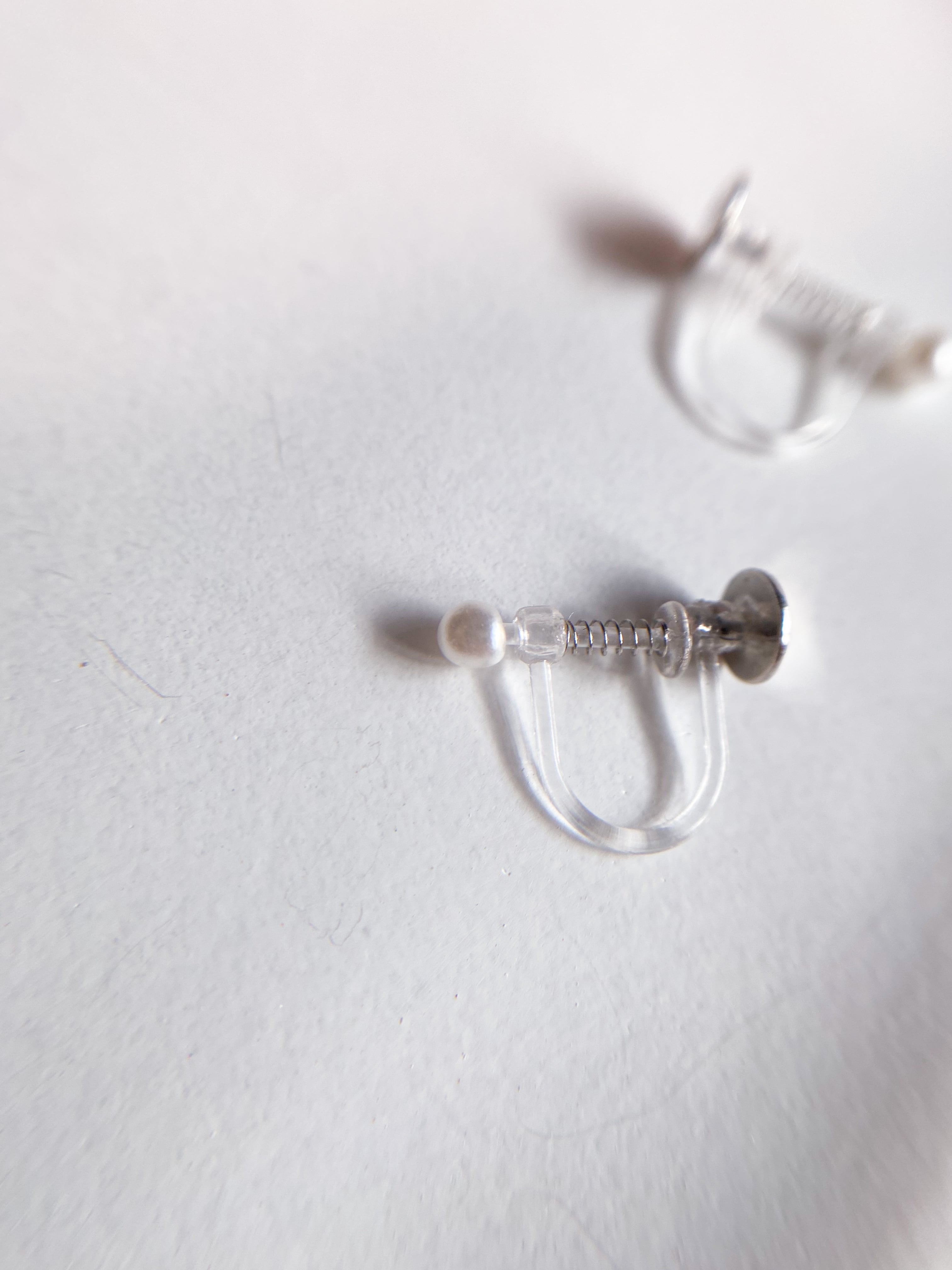 ▶︎イヤリングは透明の樹脂製で、正面から見ても留め具が目立たず、おつけいただけます。